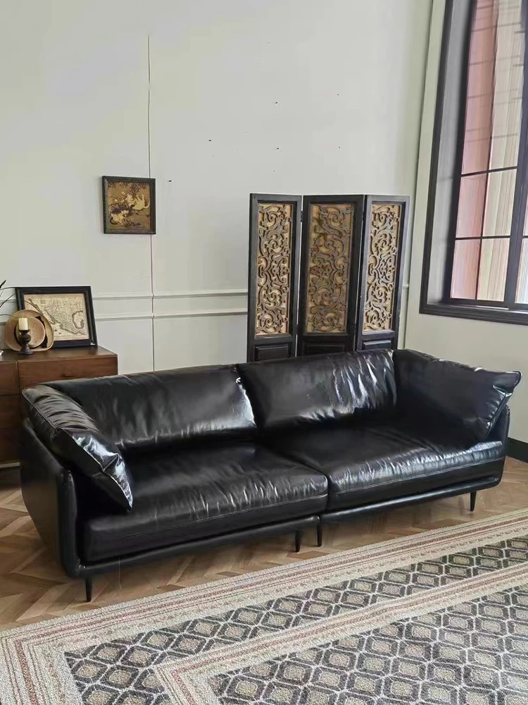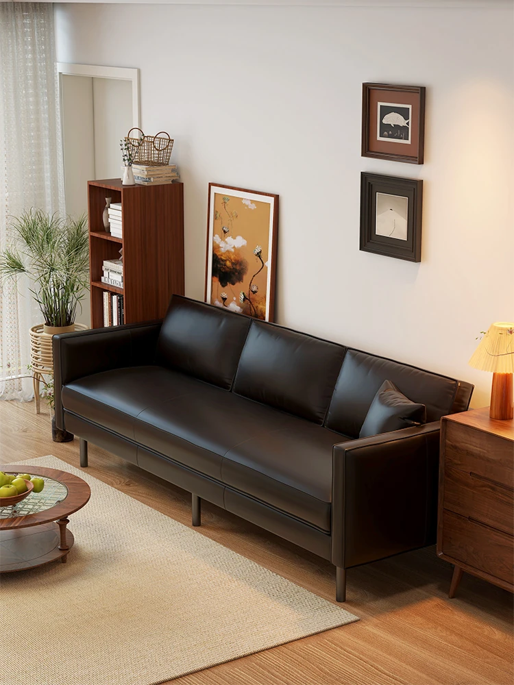Chic Italian Minimalist Black Sofa - Vintage Waxed Leather 3-Seater for Small Living Rooms - Elegant Double-Row Design, Perfect for Cozy Spaces
