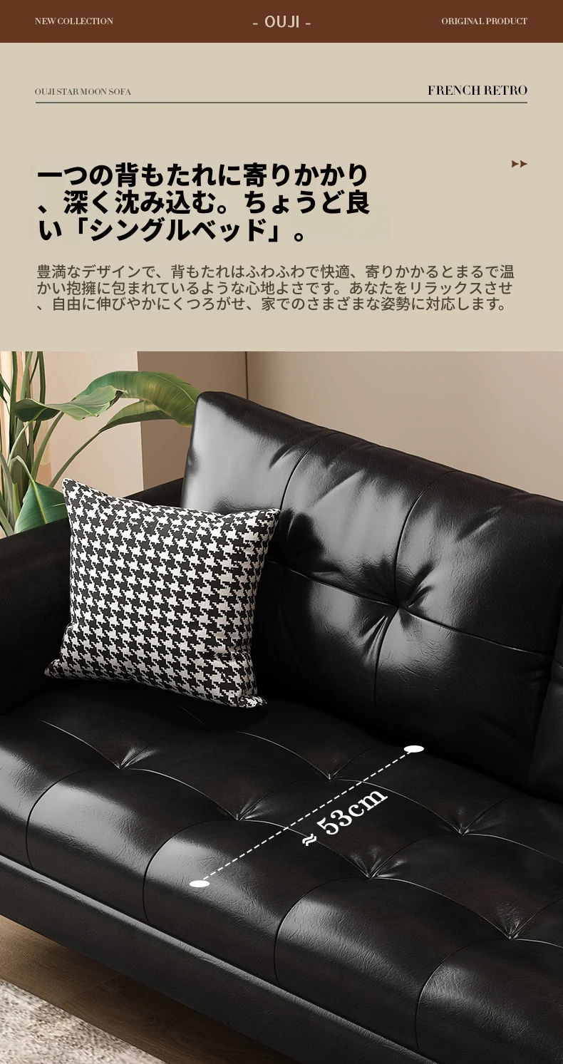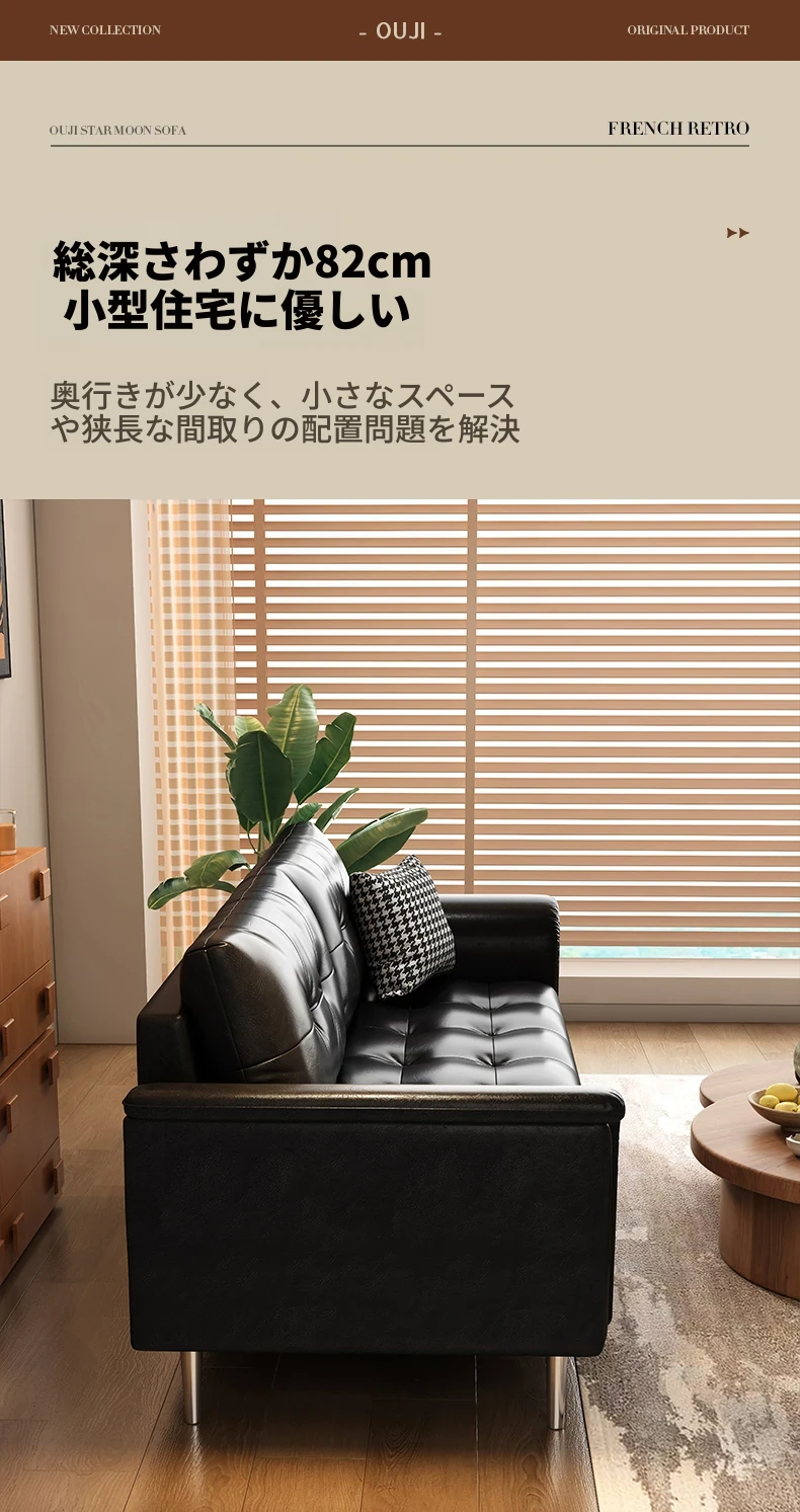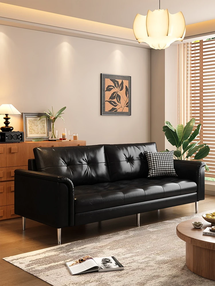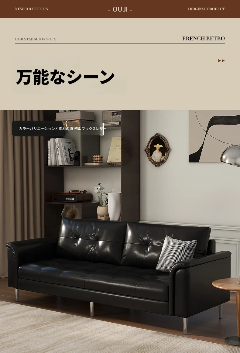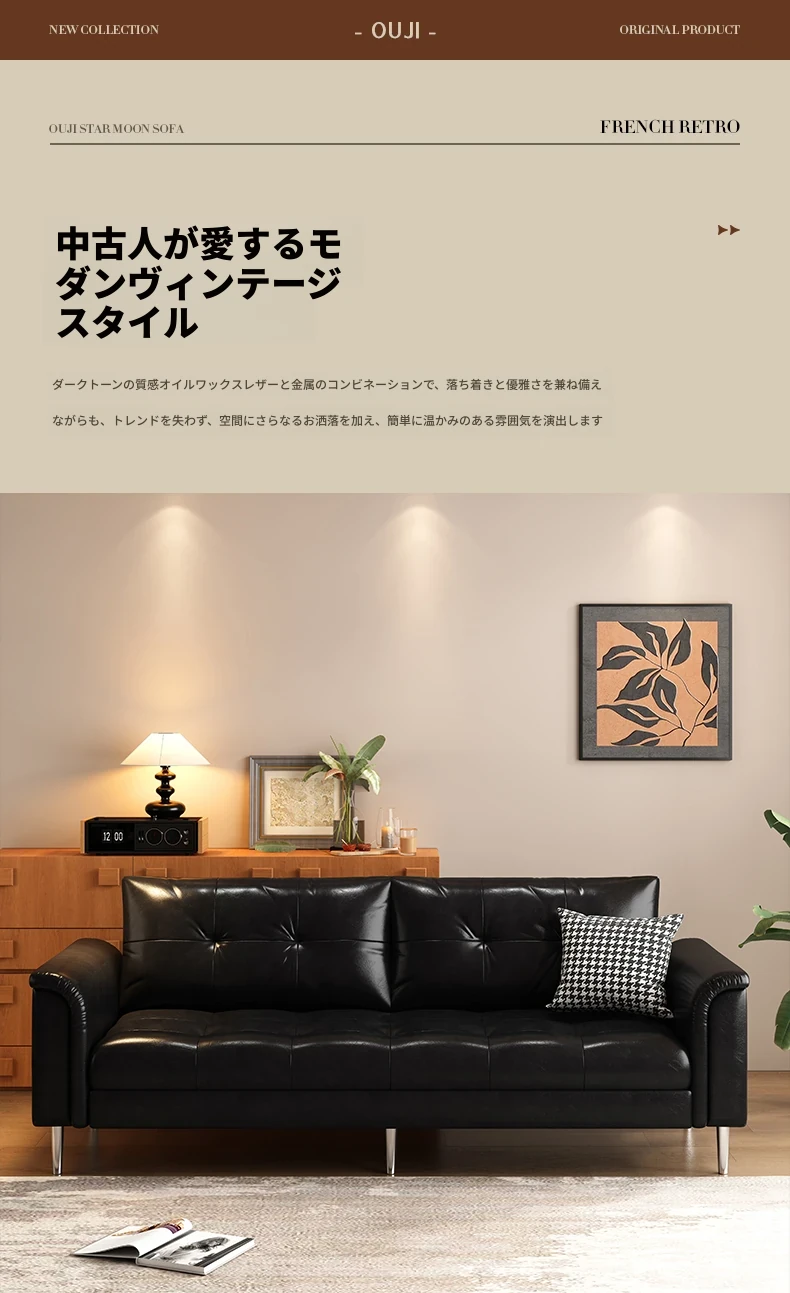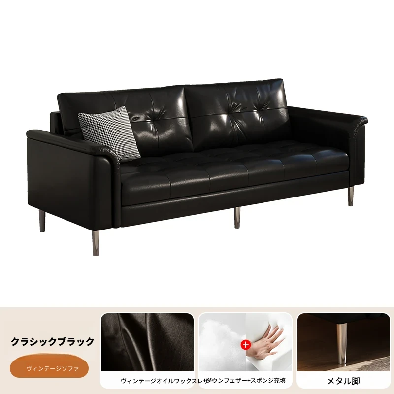 黒のイタリアンミニマリストオイルワックスレザーソファ、小型リビング向けのレトロアメリカンスタイル、宇宙のようなデザインで個性的な空間を演出!おしゃれで機能的な選択肢です。